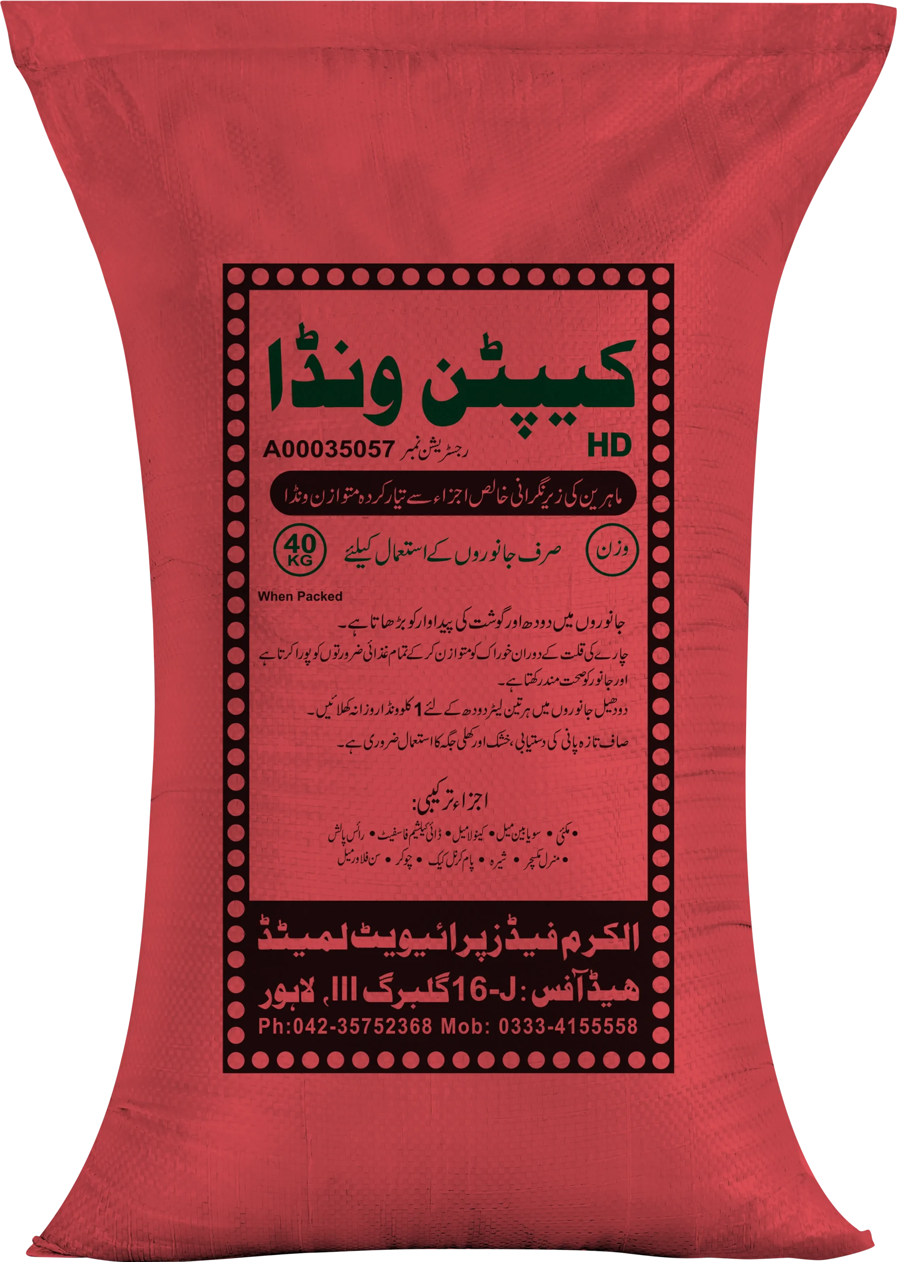 Some animals demand more from their feed — higher-producing dairy cows, rapidly growing beef cattle, and animals under increased physical stress all require a formulation that goes beyond standard nutrition. Al-Karam Captain Wanda HD is precisely that solution, developed under close expert supervision using pure, high-quality ingredients to create a heavy-duty balanced feed that fully meets all nutritional requirements of working livestock throughout the year. This powerful formula actively increases both milk and meat production, with dairy animals consistently yielding up to 1 kilogram of wanda per 3 litres of daily milk output — a ratio that speaks directly to its nutritional efficiency and value for money. During fodder scarcity, Captain Wanda HD steps in as a complete nutritional replacement, keeping animals healthy, active, and performing at their peak without any compromise. Formulated from soya bean meal, canola meal, dicalcium phosphate, rice husk, mineral mixture, molasses, palm kernel cake, choker, and sunflower meal, and registered under license A00035057, this is the premium choice for farmers who expect the very best from their livestock and their feed.