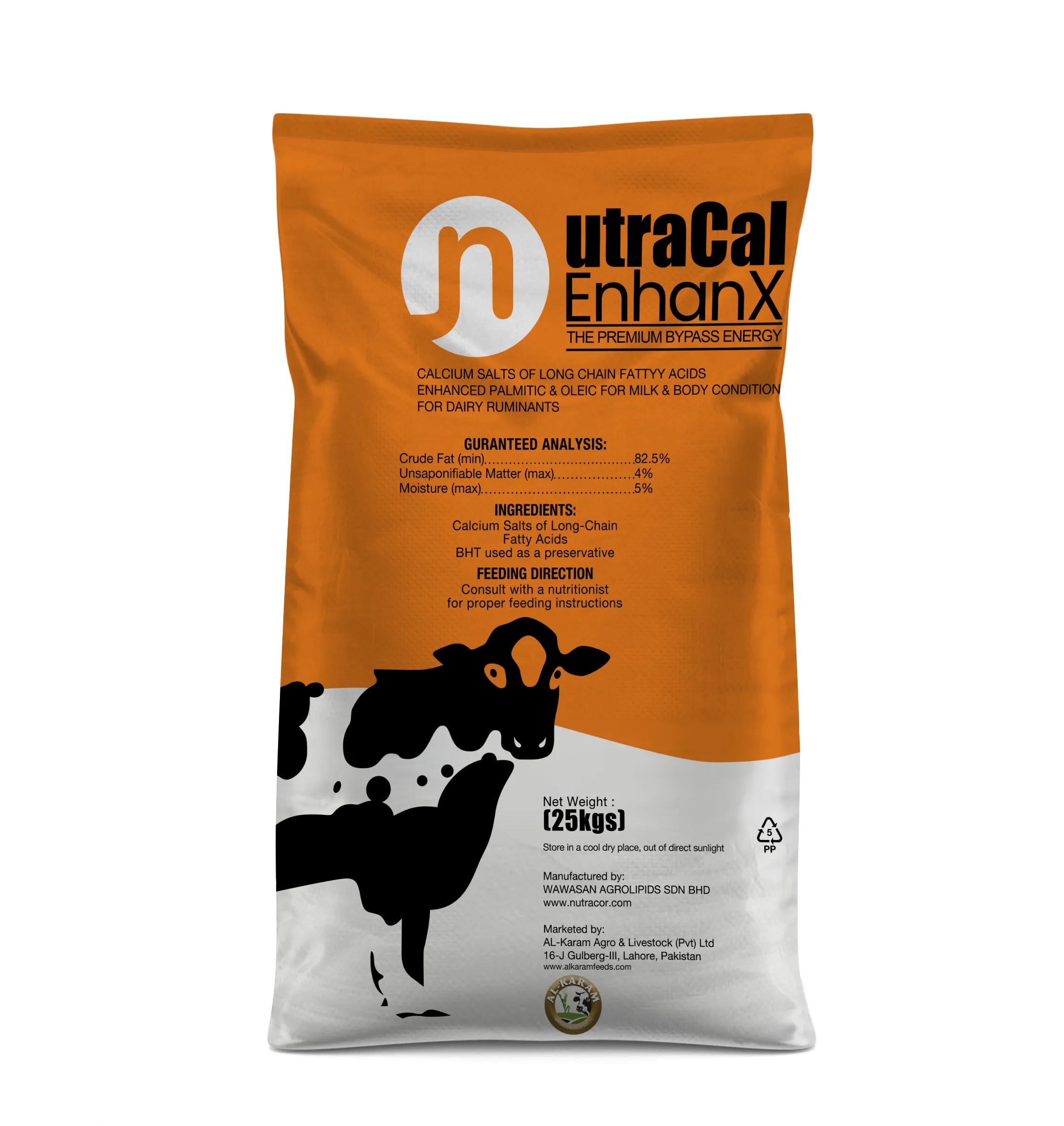 High-producing dairy cows and buffaloes often face a critical energy deficit during peak lactation, when the animal’s nutritional demands far exceed what standard feed alone can supply. Al-Karam NutraCal EnhanX is a premium bypass energy solution that addresses this challenge directly, delivering a concentrated source of protected fat in the form of calcium salts of long-chain fatty acids that pass through the rumen intact and are absorbed in the small intestine for maximum energy utilization. With a guaranteed crude fat content of 82.5% and an enhanced palmitic and oleic acid profile, NutraCal EnhanX is specifically designed to increase milk fat percentage, improve overall milk yield, and help dairy animals maintain healthy body condition scores throughout the demanding early lactation period. Unlike conventional fat supplements, its bypass nature ensures no disruption to rumen fermentation or fiber digestion, making it safe and effective for daily use alongside existing feed rations. Marketed by Al-Karam Agro & Livestock Pvt Ltd and manufactured by Wawasan Agrolipids, this internationally produced supplement brings world-class dairy nutrition technology to Pakistani farmers. Consult a livestock nutritionist for proper feeding rates tailored to your herd’s specific production level and body condition.