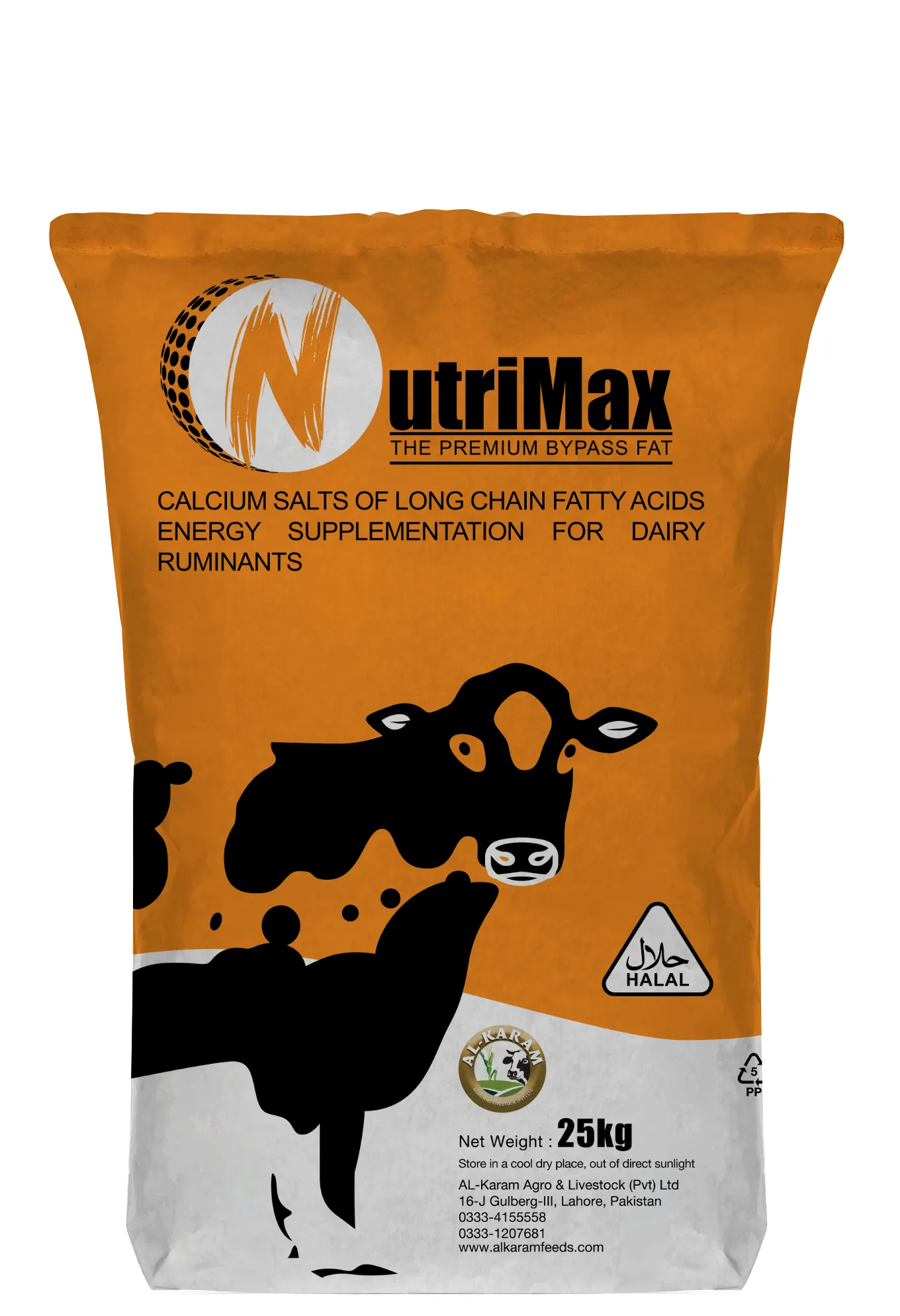 Energy deficiency during peak lactation is one of the most common and costly challenges in dairy farming, and Al-Karam NutriMax is the premium bypass fat solution developed specifically to overcome it. Formulated from calcium salts of long-chain fatty acids and carrying full halal certification, NutriMax provides a highly concentrated and rumen-protected energy source that is absorbed directly in the small intestine, delivering its full caloric value to the animal without interfering with rumen microbial activity or fiber digestion. This makes it uniquely effective at bridging the energy gap that high-producing cows and buffaloes experience in the weeks following calving, when milk production demands peak but dry matter intake has not yet fully recovered. Regular supplementation with NutriMax supports noticeably higher daily milk yield, improved milk fat content, better body condition score maintenance, and stronger reproductive performance — all of which directly impact the profitability of a dairy operation. Marketed directly by AL-Karam Agro & Livestock Pvt Ltd from Lahore, NutriMax combines international-grade bypass fat technology with the trust and accessibility of a locally available Al-Karam product, making premium dairy nutrition more practical and affordable for Pakistani farmers at every scale.