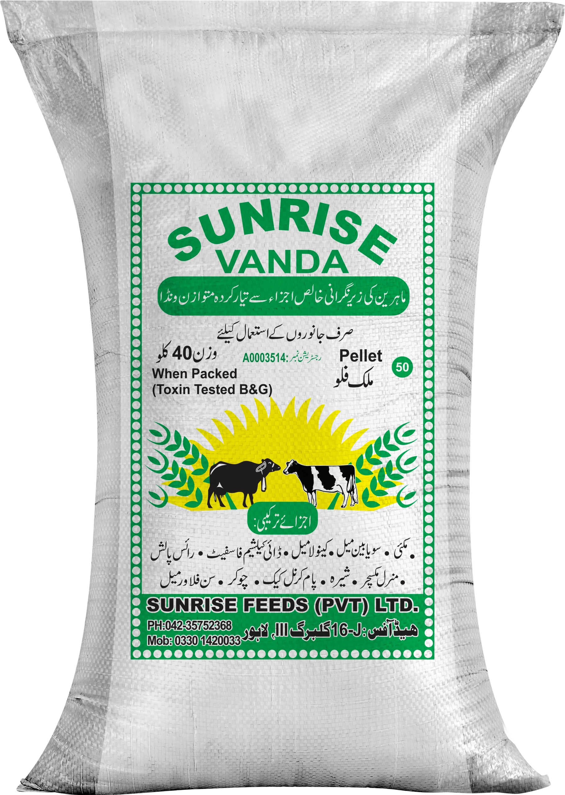 Al-Karam Sunrise Vanda Pellet 50 Milk Flow is a registered (A0003514) and toxin-tested dairy cattle feed formulated to meet the demanding nutritional requirements of high-yielding cows and buffaloes across all stages of their lactation cycle. Built on the same trusted Sunrise Vanda foundation, this pellet variant is specifically engineered to support sustained milk flow with a nutrient-dense formula that delivers the right balance of energy, protein, and minerals in every single serving. Each bag undergoes strict toxin testing for both buffalo and cow suitability, ensuring complete safety and consistent quality that farmers can rely on batch after batch throughout the year. The pellet format guarantees uniform nutrient distribution with no selective feeding, reducing wastage and ensuring every animal in the herd benefits equally from the full nutritional profile of the feed. Prepared under expert supervision from a premium blend of maize, soya bean meal, canola meal, dicalcium phosphate, rice husk, mineral mixture, molasses, palm kernel cake, choker, and sunflower meal, this feed provides everything a productive dairy animal needs in one complete, easy-to-manage daily ration. For farmers who want registered quality, certified safety, and reliable milk production results all in one bag, Sunrise Vanda Pellet 50 is the answer.