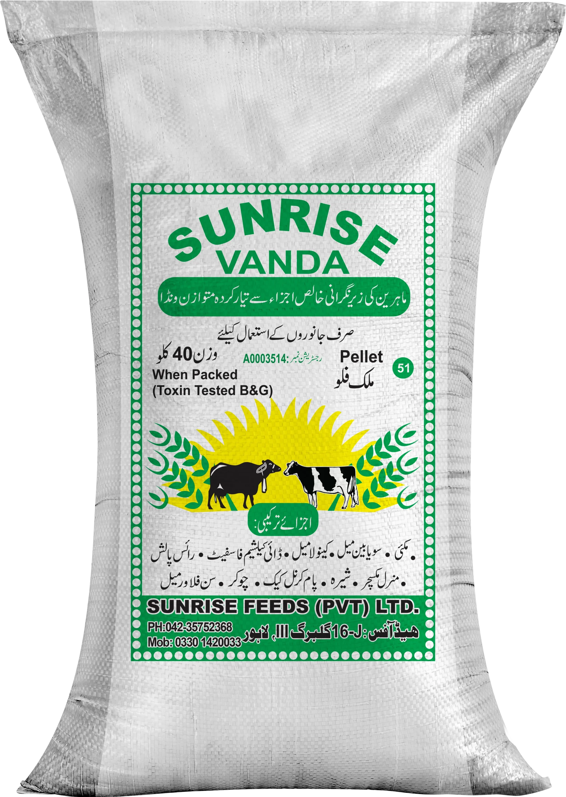 Al-Karam Sunrise Vanda Pellet 51 Milk Flow continues the trusted Sunrise Vanda series with a registered (A0003514), toxin-tested formulation that dairy farmers across Pakistan depend on for consistent, day-to-day milk production results. This pellet is specifically crafted to address the full spectrum of nutritional needs that high-producing cows and buffaloes require throughout their lactation period, providing a steady and reliable supply of energy, protein, and essential minerals in every serving. Like all products in the Sunrise Vanda range, Pellet 51 undergoes thorough toxin testing for both buffalo and cow suitability before reaching the farm, giving farmers complete assurance that their animals are consuming a safe, clean, and contamination-free feed at all times. The dense compressed pellet format minimizes feed wastage, prevents selective eating, and ensures the entire nutritional profile of the formula reaches every animal consistently across the herd. Produced from a high-quality blend of maize, soya bean meal, canola meal, dicalcium phosphate, rice husk, mineral mixture, molasses, palm kernel cake, choker, and sunflower meal, this feed is a complete daily nutrition solution for serious dairy farmers who want dependable performance, verified safety, and strong milk yields from every animal they manage.
