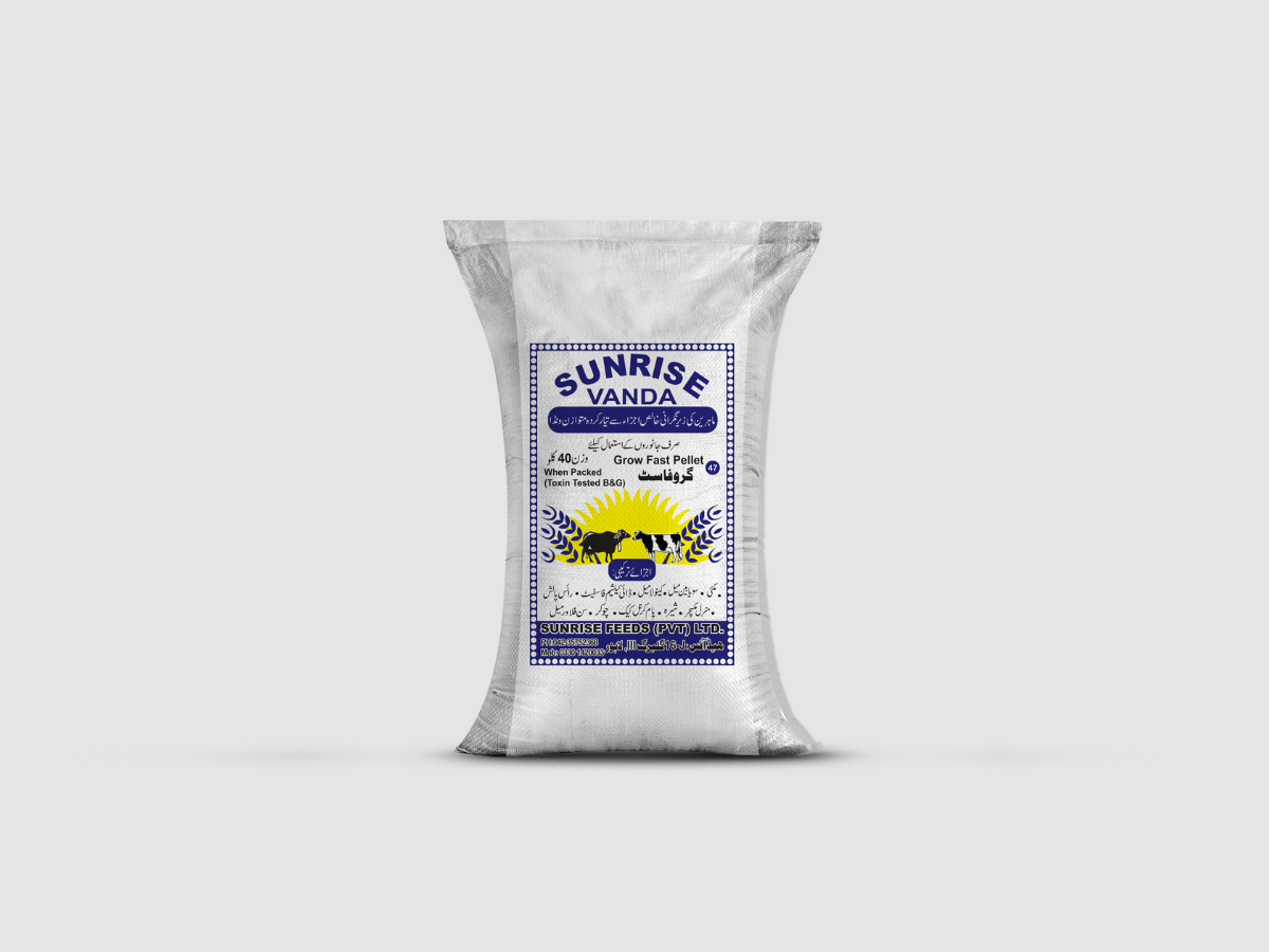 Sunrise Vanda Grow Fast Pellet is a premium, toxin-tested cattle feed specially formulated for fast growth, higher milk production, and improved animal health. Made with high-quality ingredients, this 40kg feed enhances digestion, boosts energy, and supports overall performance in cows and buffaloes. Ideal for dairy farms seeking reliable and nutritious animal feed.