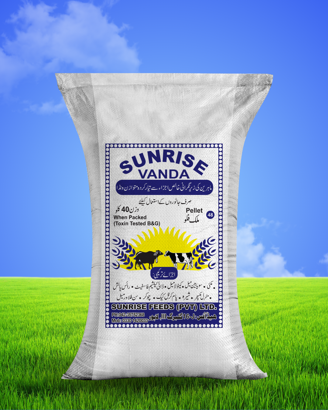 Sunrise Vanda 40kg Pellet Feed is a high-quality, specialized animal feed formulated with essential ingredients for the health and growth of livestock. This “Toxin Tested B&G” pellet ensures a safe and balanced diet for your animals. Produced by Sunrise Feeds (Pvt) Ltd., it is an ideal choice for farmers seeking nutritious and reliable feed. Ingredients include proteins, carbohydrates, vitamins, minerals, and other necessary nutrients. Available in a convenient 40kg bag.